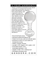 There's something exquisitely erotic about a perfectly round glass ball, and this body-safe plug lets you explore that unique feeling with a generous base for safety. Experience the slick, slippery surface with your favorite lubricant and enjoy the gliding sensation only real glass delivers! Extremely hygienic and nonporous, this toy is also a perfect candidate for temperature play - just immerse in warm or cool water before use and enjoy the delicious sensations! Five Year Warranty.