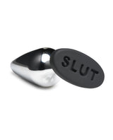Spice things up with this metal butt plug! On the silicone base is the word SLUT so your partner can see exactly what kind of naughty lover you are! The aluminum alloy plug is a lightweight metal that can be used for temperature play. Heat it up or cool it down by running it under hot or cold water. The tapered tip makes insertion easy and the metal plug is non-porous, glides in easily, and nickel-free. The premium, phthalate-free silicone base is wide and flanged so it is safe for anal, but thin enough so it can fit between your butt cheeks! Use with water-based lubricants for best results. After use, wash with warm water and mild soap and then rinse it and spray it with a toy cleaner. Let air-dry.