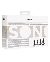 For all you backdoor lovers or those who want to try some anal fun, SONO has developed a fantastic 4-piece butt plug set! Made from flexible, highly durable and odourless TPE rubber, these plugs will give you hours and hours of amorous anal adventures! All plugs are absolutely phthalate-free. Each toy comes in a distinct shape and size giving plenty of different and exciting options. All plugs are waterproof (IPX7) and come with a wide ergonomically designed base handle for easy and safe removal and to keep the toy in place.