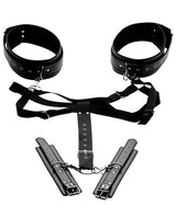 Your submissive lover wants to be even more vulnerable to your desires! Put them in this positioning harness to spread their legs open and keep their wrists trapped behind their back. Four points of adjustability allow you to customize the chest harness to your partners size. The elegant ankle and wrist cuffs are also fully adjustable with the buckles. This comfortable positioning aid can be used during foreplay or sex to pleasure your pet... and yourself! Back strap adjusts from 5 to 10 inches. Wrist cuffs adjust from 6 to 10 inches in circumference. Thigh cuffs adjust from 13 to 23 inches in circumference. Chest strap adjusts up to 45 inches in circumference. From XR Brands.