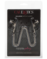 Tantalize and tease your sensitive sweet spots with the Nipple Play Bull Nose Nipple Clamps. The easy to use, fully adjustable clamps are designed with your ultimate pleasure in mind. Experience new levels of erotic sensations, and enjoy extended nipple play, with the comfortable to wear clamps. First time and experienced users will adore the intense orgasmic experience. The clamps are made from non-tarnishing nickel-free iron and feature soft, comfortable phthalate free PVC pads and easy twist screws. The multi-use clamps are attached via a sturdy high-quality chain, for increased sensual eroticism and versatile stimulation. The clamps measure a discreet 2”/5cm and are suitable for his and her personal satisfaction. To increase the sensitivity the clamps can be used with a hardening arousal gel or quality lube. Use to explore your wild side. The adjustable clamps are easy to attach to the nipples and can also be used on other super sensitive areas of the body. Open the clamps by squeezing, and place direct on to the nipple, before releasing the clamps. The pleasurable sensations are heightened by the weight of the nickel free iron chain. Before and after every use, clean the clamps with a toy cleaner spray.