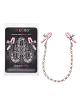 Push sensation to the next level and enjoy teasing nipple play with the Nipple Play® Crystal Chain Nipple Clamps; Explore elevated sensation with the 2 fully adjustable nipple clamps, teasing chain and sparkling crystals. Reach new levels of playful pleasure with the adjustable clamps; Clamp the naughty clasps to your body and enjoy every rush of pain and pleasure. The teasing clamp has adjustable tension to stimulate anywhere on your body for playful teasing; As the tension tightens, the tingles intensify with every turn of the dial for the ultimate in nipple stimulation toys. With the teasing clamp stimulation and increased blood circulation, you can look forward to amplifying nipple sensitivity and intensify overall arousal; These easy-to-use nipple teasers are great for him or her. The two adjustable clamps are made from nickel-free iron with silicone cote, an nickel-free iron chain and Silica crystals.