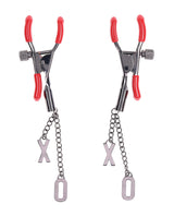 Indulge in a blend of pleasure and style with the Ex's & Oh's Nipple Clamps. These elegant gunmetal clamps are designed with soft red rubber tips for a comfortable yet tantalizing experience. Perfect for beginners and beyond, the clamps are fully adjustable, allowing you to control the tension and pressure for a customized fit. The eye-catching X and O charms dangle seductively, adding a playful, aesthetic touch to every session. Whether for solo exploration or shared intimacy, these nipple clamps offer the ideal combination of sophistication, fun, and functionality.