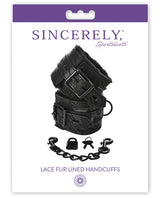 Lace Fur Lined Hand Cuffs offer beauty without compromising on durability. Use (2) lock and keys to tease and explore power exchanges. Pair with your favorite Satin Blindfold or fur flogger for more extreme sensory play. Adjustable buckle and strap make wearing and removal simple yet secure. Cuff length is 10 inches (25.4cm) and width is 2.5 inches (6.35cm). Ingredients: 30% polyurethane, 30% polyethylene, 30% polyester, 10% nickel free metal