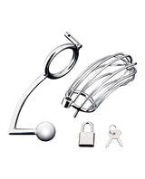 Experience the perfect fusion of denial and stimulation with the Blue Line Cock Cage with Anal Stimulator. Crafted to heighten sensations, this sleek silver device restricts erections while delivering deep, targeted pleasure to the perineum and anus with a firm metal bulb. The cool, smooth sensation of the metal ring adds extra intensity, ensuring every moment is both torturous and tantalizing.