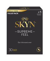 Upgrade to the new era of SKYN condoms with SKYN SUPREME FEEL and experience the ultimate comfort and natural fit. Made from our revolutionary SKYNFEEL material, these premium, polyisoprene lubricated condoms are our thinnest ever, and provide supreme sensitivity and skin-on-skin feeling with a long-lasting, ultra-smooth lubricant. They are non-latex, making them a great choice for anyone with latex allergies or sensitivities, and don't have a rubber latex smell. SKYN's SUPREME FEEL non-latex condoms are as strong as premium latex, tested to the highest safety standards of safety and reliability and are safe to use with water-based lube and silicone lube. SKYN FEEL EVERYTHING.