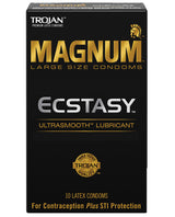 Trojan Magnum Ecstasy large-size condoms are designed to enhance pleasure by allowing you to feel the sensation, not the condom. Featuring a revolutionary comfort shape, these condoms provide freedom of movement for a more natural experience. They are textured for female stimulation while being tapered at the base for a secure fit.