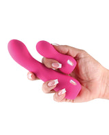 The toy combines internal G-spot stimulation with external vibration from the included bullet for a blended pleasure experience.