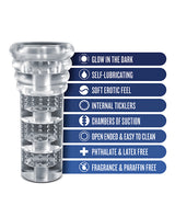 Get ready for an out-of-this-world experience with the Blush Rize Luz! This exciting stroker is self-lubricating—just add water or saliva, and it becomes instantly slippery for smooth, effortless pleasure. To make things even more thrilling, the Luz glows blue in the dark, enhancing the fun during nighttime play. Its interior features soft ticklers and ribbed chambers designed to massage your pressure points, creating unparalleled sensations with every stroke. The open-ended design accommodates any shaft size, while its squeezable, flexible material lets you control the intensity. Made without phthalates, fragrances, paraffins, or latex, the Luz is body-safe and easy to clean.