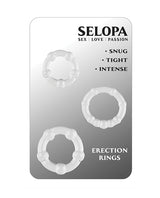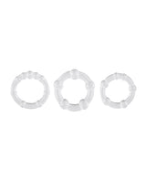 Strengthen your erection with this 3-ring collection that offers 3 levels of support - snug, tight & intense. Use one super-stretchy ring at a time or all 3 at once to enjoy a harder, girthier experience.