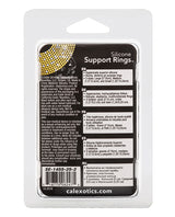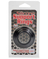 Elevate your seduction performance and intimate encounters with the Silicone Support Rings. The durable, stretchy erection enhancers are easy to use, comfortable to wear and perfect for self-gratification pleasure and exotic couple's fun. The multi-purpose adornment rings are the perfect accessory for exploring your secret erotic fantasies and wild desires. The comfortable enhancers are made from unscented 100% pure silicone and are supplied in a set of three. The medium, large and generous extra large cock rings are designed for erection stimulation and stamina maintenance. The pliable, sleek and smooth rings comfortably slip onto the erect penis for arousal and stimulation support, during intimate solo exploration and intimate couple's pleasure. To increase sensitivity and to maximize and heighten the ecstasy, it is recommended that you always use a quality lube with this erection keeper toy. Perfect for discreet performance maintenance, the enhancer set are great for spontaneous play, and are ideal for first-time and experienced users. The individual enhancer rings can be used alongside your favorite vibrating stimulator toys for extended enjoyment. Slip on your preferred stretchy ring size and prepare to indulge in endless tantalizing explosions. Before and after every use, clean the premium quality silicone adornment rings with a toy cleaner spray, or wash in warm, soapy water.