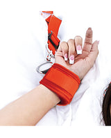 You no longer need a dungeon with this convenient 7-piece bondage set that easily allows you to turn your bed into the ultimate setting for intense BDSM play. The Lux Fetish 7-Piece Bedspreader in a fun purple color is a must-have for every kind of restraint play enthusiast — whether you're a hardcore bondage fan or a first-time kink explorer. The set includes four adjustable cuffs made of neoprene, tethers and four straps that connect to a center band that can be used on beds of all sizes. Each strap features a cuff attached to an O-ring with a swivel clip to keep a submissive partner comfortably and securely in a spread open position and ready for kinky fun. The set-up for this bedspread kit is easy; and when playtime is over, you can discreetly tuck the cuffs away under the mattress until your next kinky session. Intensify the sensation of every touch by place the included blindfolded over the eyes of the restrained partner.