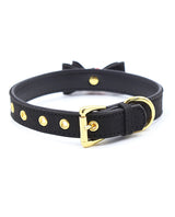 Gift your precious kitty with their very own collar! The bell, bow tie accent, and jet black aesthetic lets your sub show off their inner submissive feline with a sultry style! Made with durable yet soft PU leather for comfort, especially useful for extended kitty play sessions. This bell tinkles with every spank, shiver and thrust! Wear around your home or during scenes to show off your inner submissive kitty. Gift this collar to your playmate as a symbol of your ownership and protection. The black, gold and red, perfect for the dungeon or a night on the town! The adjustable buckle fits necks from 12.8 inches to 16.5 inches for the perfect fit! Measurements: Overall length 19 inches, adjusts from 12.8 inches to 16.5 inches. Materials: PU Leather, Metal.