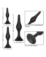 Ease yourself into thrilling anal sensation with the Silicone Anal Starter Kit. This naughty kit includes a set of 3 graduated tapered anal plugs meant to let you safely and comfortably increase passionate anal stimulation. To enjoy everything the exhilarating world of anal play has to offer, training is in order to ensure total safety and satisfaction. Each probe in our kit gradually increases in length and girth for superb pleasure at any level of pleasure play.
